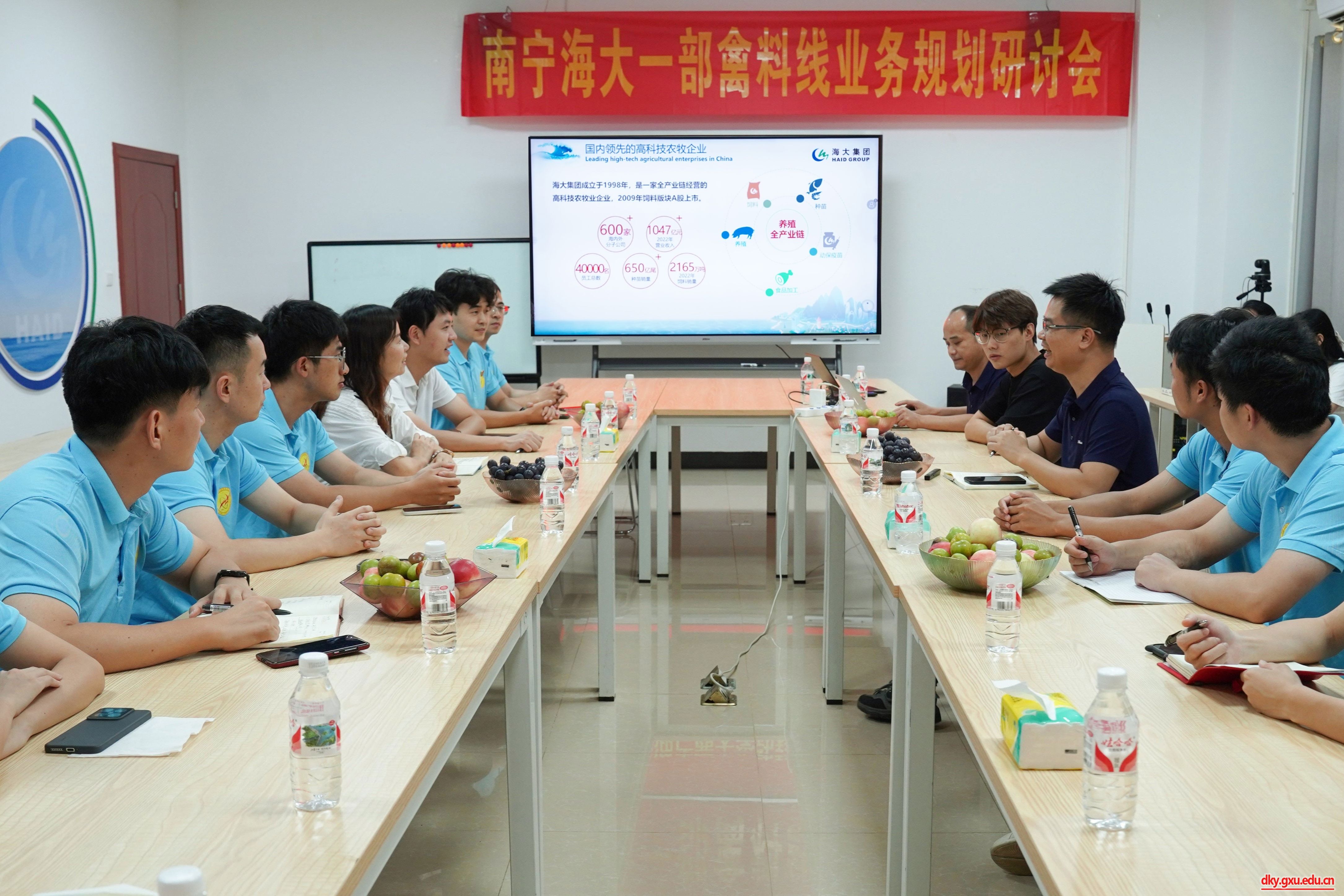 The practice team of teachers and students visited Nanning Haida Biotechnology Co., Ltd. and had discussions and exchanges with the responsible comrades and alumni representatives. They comprehensively understood its development history, business sectors, technology research and development, and had lively discussions on talent cultivation, industry education integration, internship practice, and other aspects.